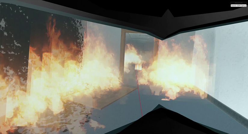本系統(tǒng)基于三維建模、仿真引擎等技術(shù),配合HTC-viveVR外設(shè),模針公寓火災(zāi)發(fā)生,消防戰(zhàn)士滅火并實(shí)施相應(yīng)的應(yīng)急措施救援體驗(yàn)。