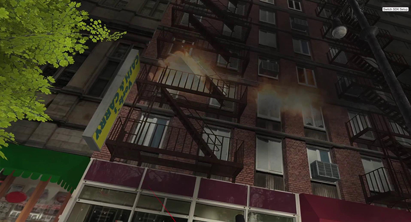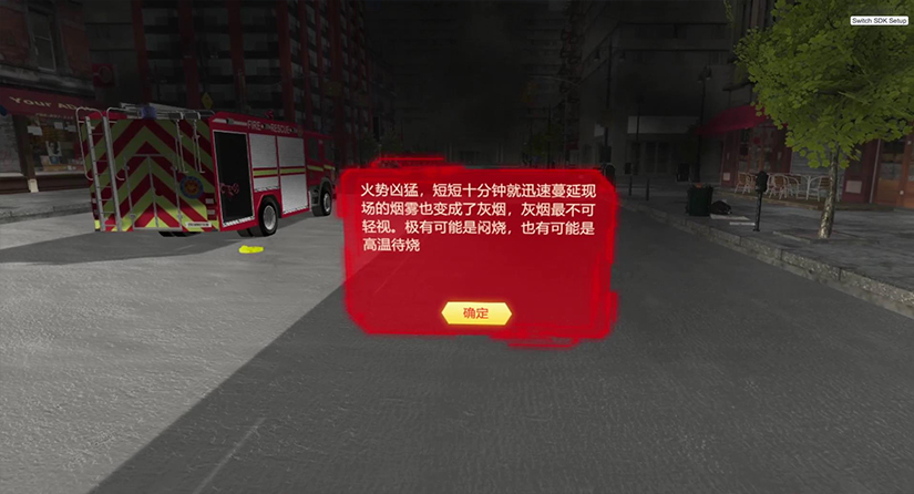 進(jìn)入系統(tǒng)體驗(yàn)場(chǎng)景,出現(xiàn)背景介紹UI,提示某居民樓起火,起火原因不明等;