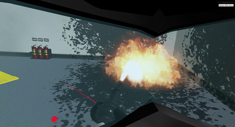 1. 體驗(yàn)者成功離開(kāi)室內(nèi)后,手拿噴水槍進(jìn)行滅火,并出現(xiàn)火勢(shì)滾滾,系統(tǒng)提示此時(shí)是黑煙并找到起火點(diǎn)UI;