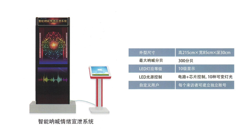 智能引導正向激勵:系統(tǒng)智能分析宣泄者的行為(包括吶喊分貝、宣泄時間等因素),判斷出其情緒宣泄的程度,根據(jù)不同宣泄的程度進行智能化的正向語音引導、激勵,并給予建議方案。多種宣泄情緒主題:系統(tǒng)提供了8種常見的情緒問題而設定的宣泄主題,用戶使用前先通過觸摸屏控制器選擇符合自己情緒的宣泄主題。系統(tǒng)設置管理員登陸口,方便管理及調(diào)取記錄。