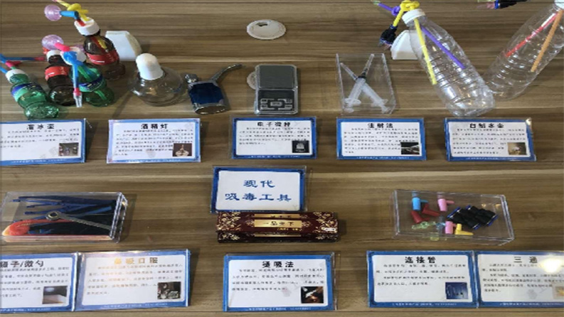 9種現(xiàn)代工具:電子秤、酒精燈、溜冰壺4個(gè)、錫紙、吸管、連接管、三通 鑷子/微勺、鼻吸口服、注射法。