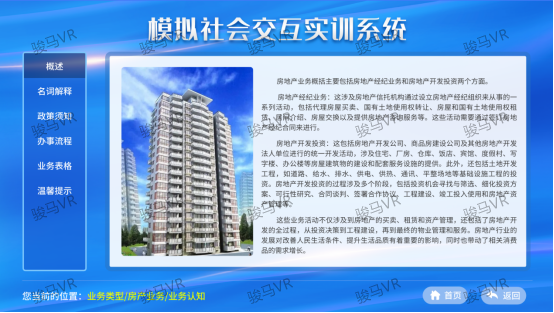 模擬社會(huì)交互實(shí)訓(xùn)系統(tǒng)具備6種模擬業(yè)務(wù)辦理知識(shí),涵蓋民政、房產(chǎn)、公證、工商、司法所及派出所等關(guān)鍵社會(huì)服務(wù)領(lǐng)域,每個(gè)模塊均細(xì)分為5個(gè)子部分,分別是繪聲繪影、業(yè)務(wù)認(rèn)知、法律講堂、隨堂測(cè)驗(yàn)、聯(lián)系直通車,旨在通過多角度、多層次的交互體驗(yàn),深化服刑人員對(duì)每一個(gè)業(yè)務(wù)流程的理解和掌握。