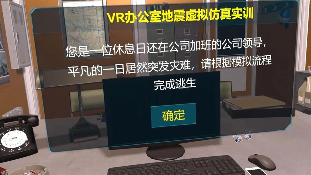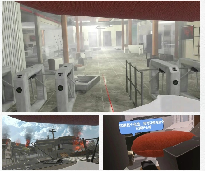 VR辦公樓地震系統(tǒng)通過(guò)虛擬技術(shù)將地震場(chǎng)景進(jìn)行高度還原,讓體驗(yàn)者身臨其境地感受地震發(fā)生時(shí)辦公樓內(nèi)的真實(shí)狀況,并學(xué)習(xí)和實(shí)踐地震的應(yīng)急逃生知識(shí)。當(dāng)“地震”突然來(lái)襲時(shí),系統(tǒng)會(huì)通過(guò)流程化的UI(用戶界面)提示,引導(dǎo)體驗(yàn)者在沉浸式的虛擬場(chǎng)景中,迅速找到正確的避險(xiǎn)方式和逃生路線。