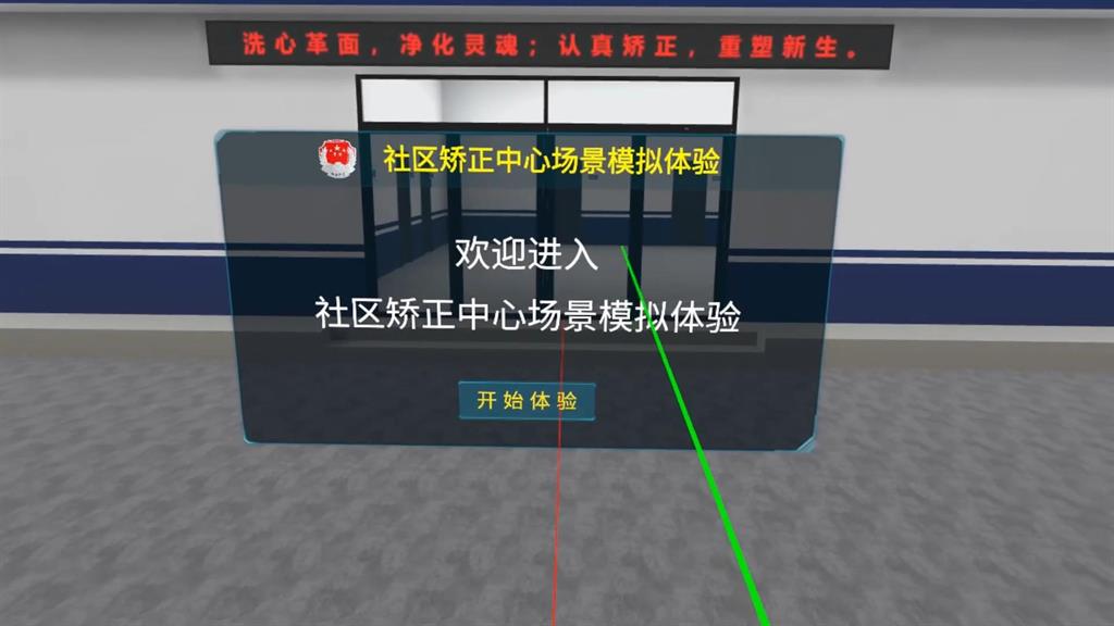 進(jìn)入VR場景,體驗者站在社區(qū)矯正中心大門前,點擊手柄即可進(jìn)入內(nèi)部。大廳內(nèi),系統(tǒng)語音隨即介紹中心的主要職責(zé)與區(qū)域劃分。隨后,體驗者可自由漫游至各功能室,系統(tǒng)會詳細(xì)介紹每室的功能及在社區(qū)矯正中的作用。此外,大廳還設(shè)有互動答題環(huán)節(jié),增強(qiáng)體驗趣味性與知識性。
